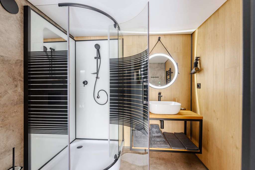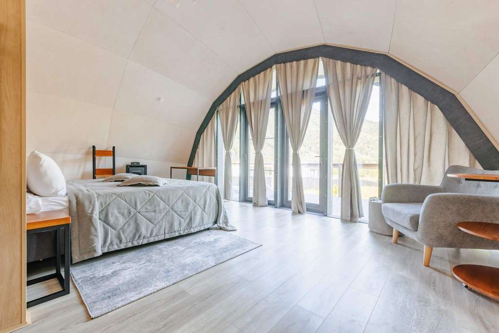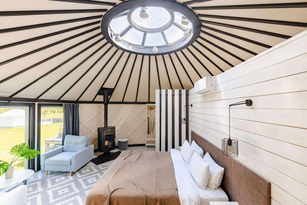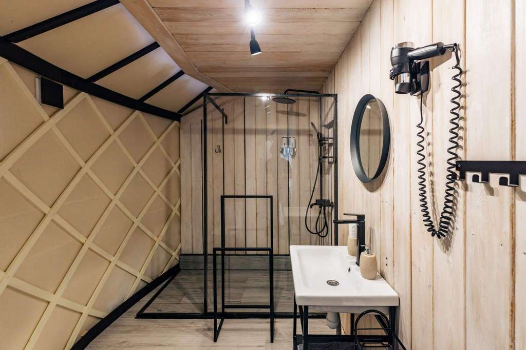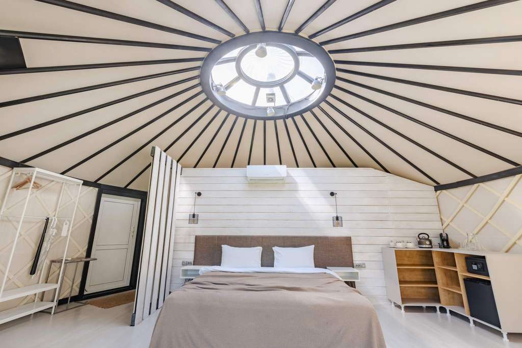 16 дизайнерских объектов (номера 4-х категорий) находятся на оптимальном удалении друг от друга, что создает чувство уединенности и спокойствия. Все номера выполнены в эклектическом стиле с элементами этно-дизайна, оснащены камином и имеют выход на собственную террасу. Только экологичные материалы.