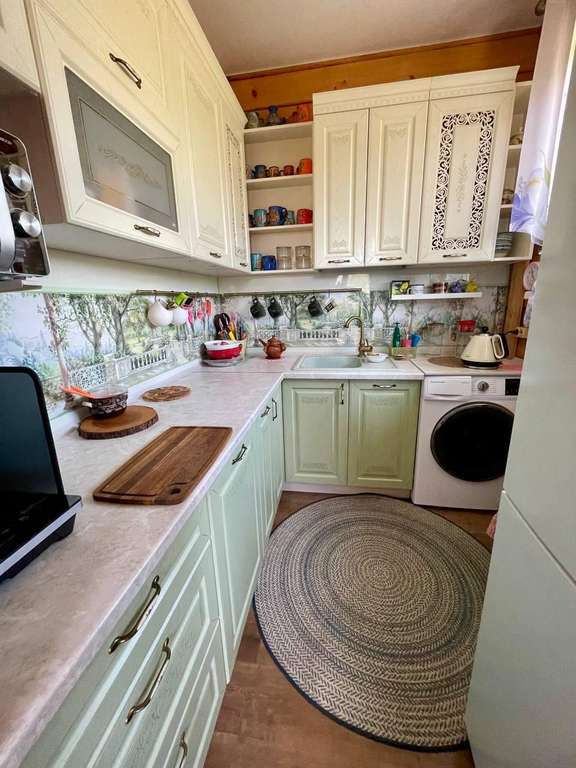 Мебель и техника: натуральная мебель по персональному проекту (лиственница) , всё новое; кухонный гарнитур и бытовая техника (2 холодильника, стиральная машина) остаются покупателю.